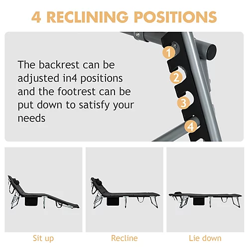 - Adjustable Backrest & Footrest: This folding beach chaise lounge features premium locking system, providing you with 4 different reclining positions. And the footrest also can be put down based on your preference. With this chaise lounge, you can sit, recline or lay flat on it according to your needs.