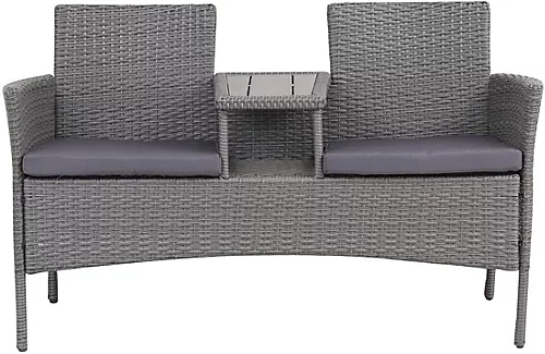 - PRODUCT DETAILS The set includes a two-seater bench with attached table and 2 dark grey seat cushions. Furniture arrives flat-pack in 1 box and will require assembly. Assembly of the set is very easy and a full instruction manual is provided with the purchase. The maximum weight allowance for the bench is up to 220kg for the entire bench. Dimensions approx in cm: Overall: 84x133x65cm (HxWxD), Seat: 40x47x48cm (HxWxD).