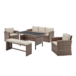 Brown Rattan Cream Cushions 5 Piece Garden Sofa Chairs Bench Glass Top Table