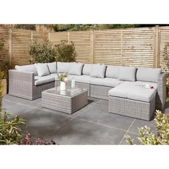 6 Seater Putty Grey Compact Rattan Weave Corner Garden Dining Set – With Stools