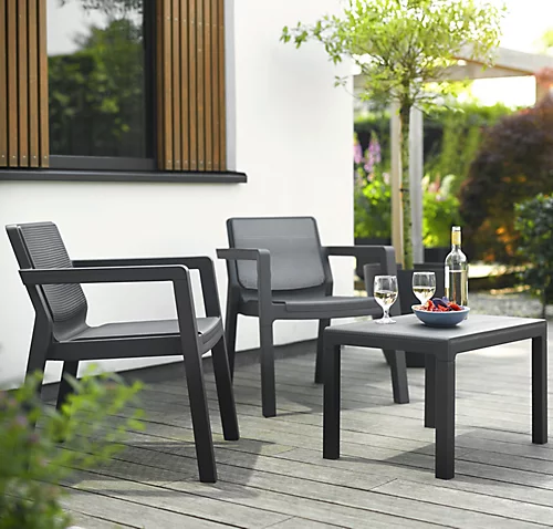 Simple, yet elegant this Emily garden set comes in a smart dark grey tone with a contemporary rattan look. Create the perfect spot for chilling with a morning coffee or afternoon wine and taking in the sunshine, great for smaller spaces such as, balconies or terraces. This set is low maintenance and can be easily styled with a range of outdoor décor styles.