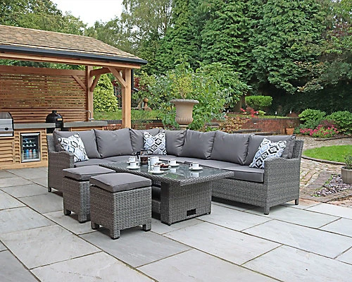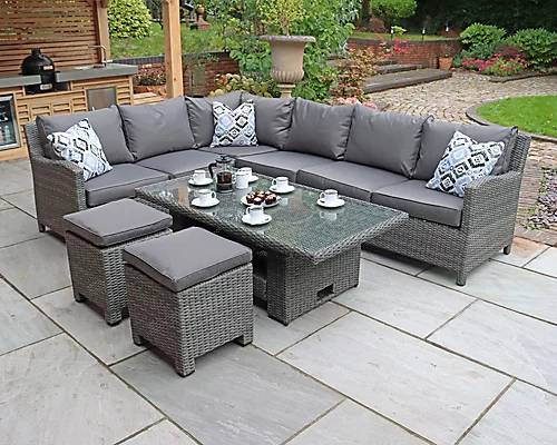 This deluxe Paris corner dining set, retaining classic style with its aluminium framework construction and hand woven synthetic half round weave rattan it offers style, comfort, strength and durability. Consisting of 150 x 80cm rectangular adjustable table, two 2 seater sofas, corner and middle chair and 2 footstools, and all cushions. The table can be adjusted to suit your needs as coffee or dining table. This set is perfect for indoors and out and will provide years of enjoyment. The cushions on this range are made using Royalcraft Weather Proof and Stain Resistant Fabric.